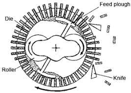 pakan dengan menggunakan roda baja (roller) pada cetakan (die). Pellet yang keluar dari cetakan tersebut kepadatannya sangat baik.